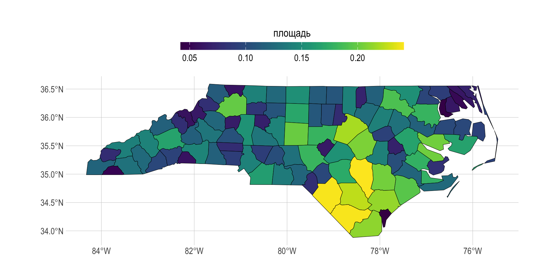 legend.title = element_text(size = 14))Пусть цвет соответствует площади полигонов графств в градусных единицах.