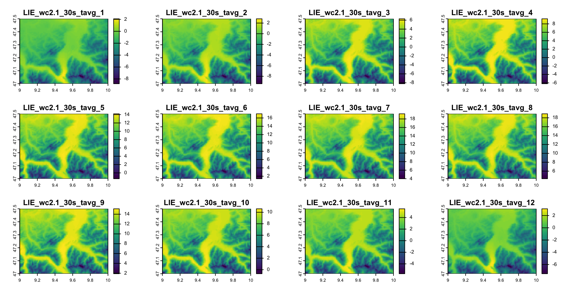 Рассмотрим среднемесячную температуру в градусах Цельсия глобальных данных о температуре из базы данных WorldClim, указав:
